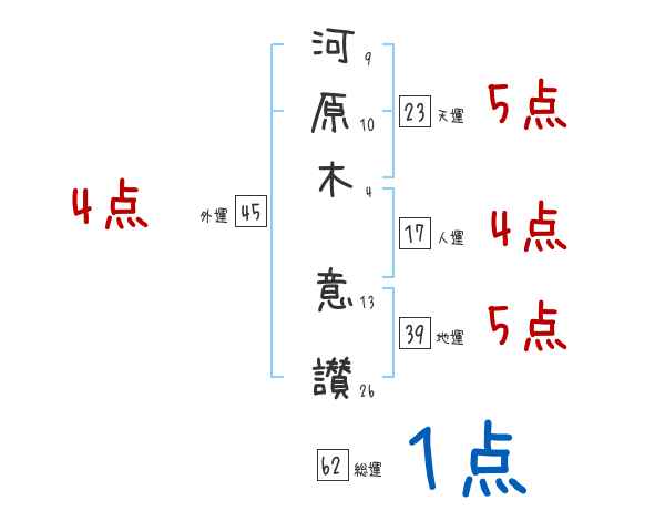 天運![]() | 河原木意讃さんの天運は23画の5つ星!想像力に優れ活力がある。一代で成功し名誉を手に入れる。 家系が持つ宿命的な運勢を表します。祖先から受け継いだ苗字ですので自分の力が及びません。家柄を象徴します。 |