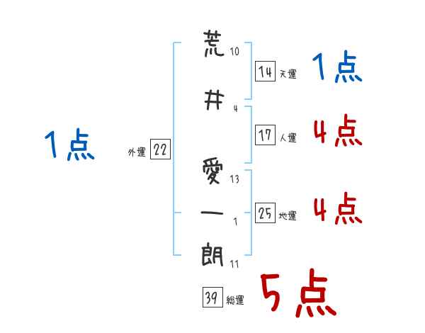天運![]() | 荒井愛一朗さんの天運は14画の1つ星!人に対して優しいがストレスを溜め込みがち。人間関係のトラブルを避けるよう気をつけましょう。 家系が持つ宿命的な運勢を表します。祖先から受け継いだ苗字ですので自分の力が及びません。家柄を象徴します。 |