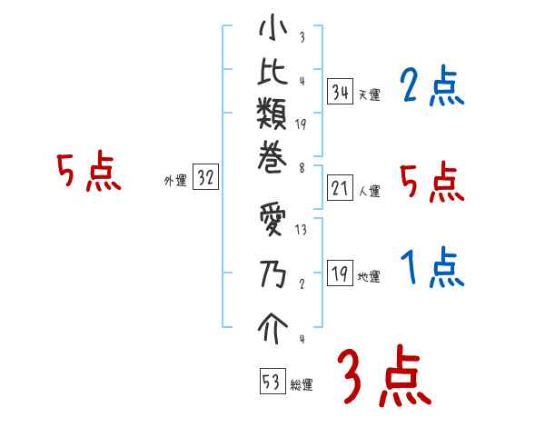 外運![]() | 小比類巻愛乃介さんの外運は32画の5つ星!柔軟性があり成功する。チャンスが多く金運が良い。 生活面を象徴する運勢です。外部から受ける影響力を表し、結婚運、家庭運や職場、環境への順応性を表します。 |