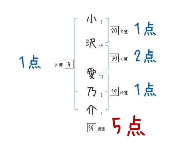 総運![]() | 小沢愛乃介さんの総運は39画の5つ星!社交性に優れ人望が厚い。人の上に立ち成功する。 あなたの人生を表す1番重要な運勢です。生涯を通じて影響する総合運となり、主に50歳以降の晩年期に影響を及ぼします。 |