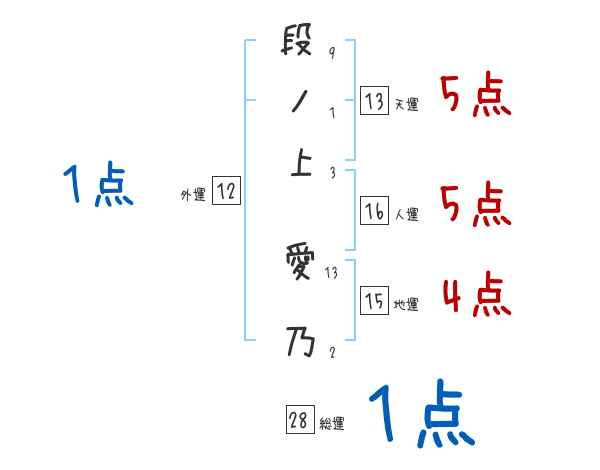 人運![]() | 段ノ上愛乃さんの人運は16画の5つ星!人望が厚く大きく発展する。逆転成功が見える。 性格や才能などを表す2番目に重要な運勢です。人間関係や協調性、社会的な成功に影響します。主に20歳から50歳ぐらいまでの中年期の運勢を表します。 |