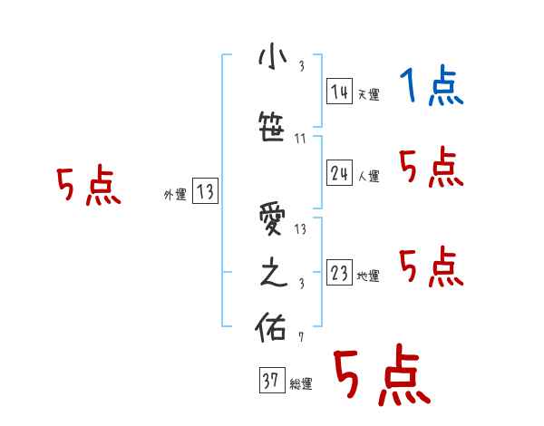 天運![]() | 小笹愛之佑さんの天運は14画の1つ星!人に対して優しいがストレスを溜め込みがち。人間関係のトラブルを避けるよう気をつけましょう。 家系が持つ宿命的な運勢を表します。祖先から受け継いだ苗字ですので自分の力が及びません。家柄を象徴します。 |