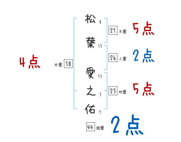 天運![]() | 松葉愛之佑さんの天運は21画の5つ星!統率力がある。独立し成功する。名誉を手に入れる。 家系が持つ宿命的な運勢を表します。祖先から受け継いだ苗字ですので自分の力が及びません。家柄を象徴します。 |