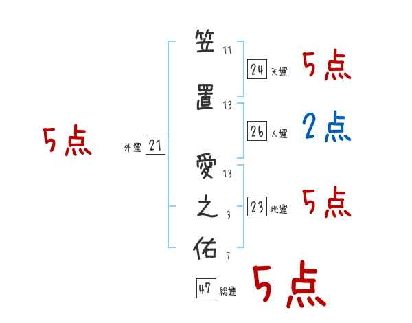 天運![]() | 笠置愛之佑さんの天運は24画の5つ星!家庭運が良く順調な人生。金運にも恵まれる。 家系が持つ宿命的な運勢を表します。祖先から受け継いだ苗字ですので自分の力が及びません。家柄を象徴します。 |