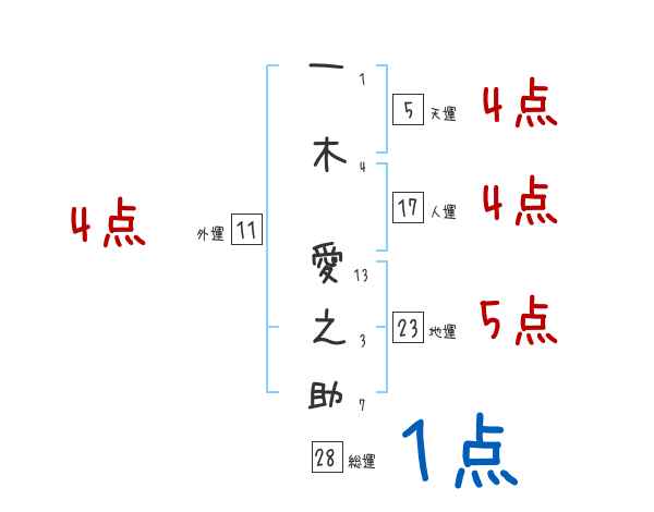 天運![]() | 一木愛之助さんの天運は5画の4つ星!健康で安泰。協調性に優れ、財産に恵まれる。 家系が持つ宿命的な運勢を表します。祖先から受け継いだ苗字ですので自分の力が及びません。家柄を象徴します。 |