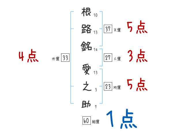 外運![]() | 根路銘愛之助さんの外運は33画の4つ星!権力志向でプライドが高い。勇気があり運を切り開き成功する。 生活面を象徴する運勢です。外部から受ける影響力を表し、結婚運、家庭運や職場、環境への順応性を表します。 |