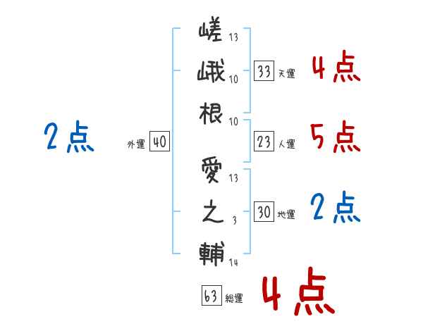 人運![]() | 嵯峨根愛之輔さんの人運は23画の5つ星!想像力に優れ活力がある。一代で成功し名誉を手に入れる。 性格や才能などを表す2番目に重要な運勢です。人間関係や協調性、社会的な成功に影響します。主に20歳から50歳ぐらいまでの中年期の運勢を表します。 |