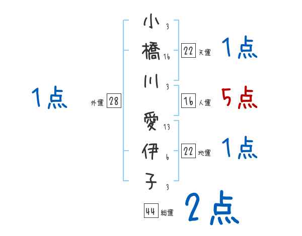 人運![]() | 小橋川愛伊子さんの人運は16画の5つ星!人望が厚く大きく発展する。逆転成功が見える。 性格や才能などを表す2番目に重要な運勢です。人間関係や協調性、社会的な成功に影響します。主に20歳から50歳ぐらいまでの中年期の運勢を表します。 |