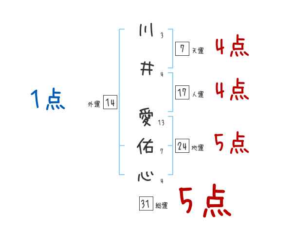 総運![]() | 川井愛佑心さんの総運は31画の5つ星!社交性があり判断力に優れる。順風満帆な人生で円満な生活。 あなたの人生を表す1番重要な運勢です。生涯を通じて影響する総合運となり、主に50歳以降の晩年期に影響を及ぼします。 |
