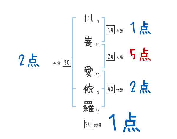天運![]() | 川嵜愛依羅さんの天運は14画の1つ星!人に対して優しいがストレスを溜め込みがち。人間関係のトラブルを避けるよう気をつけましょう。 家系が持つ宿命的な運勢を表します。祖先から受け継いだ苗字ですので自分の力が及びません。家柄を象徴します。 |