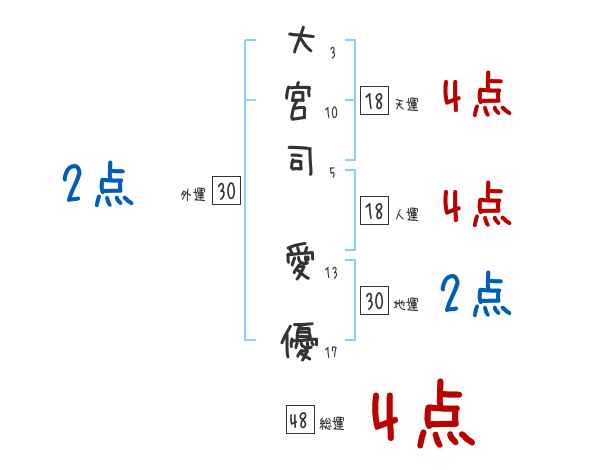 天運![]() | 大宮司愛優さんの天運は18画の4つ星!情熱的で剛気。忍耐力があり信頼される。 家系が持つ宿命的な運勢を表します。祖先から受け継いだ苗字ですので自分の力が及びません。家柄を象徴します。 |