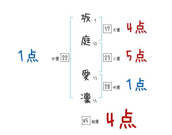 天運![]() | 坂庭愛凜さんの天運は17画の4つ星!積極的な行動力。地位を気づき財産を手に入れる。純粋な心と直感力。 家系が持つ宿命的な運勢を表します。祖先から受け継いだ苗字ですので自分の力が及びません。家柄を象徴します。 |