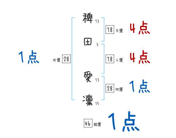 天運![]() | 稗田愛凜さんの天運は18画の4つ星!情熱的で剛気。忍耐力があり信頼される。 家系が持つ宿命的な運勢を表します。祖先から受け継いだ苗字ですので自分の力が及びません。家柄を象徴します。 |