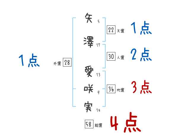 外運![]() | 矢澤愛咲実さんの外運は28画の1つ星!家庭環境に注意。スポーツで活躍できる能力があるかも。 生活面を象徴する運勢です。外部から受ける影響力を表し、結婚運、家庭運や職場、環境への順応性を表します。 |