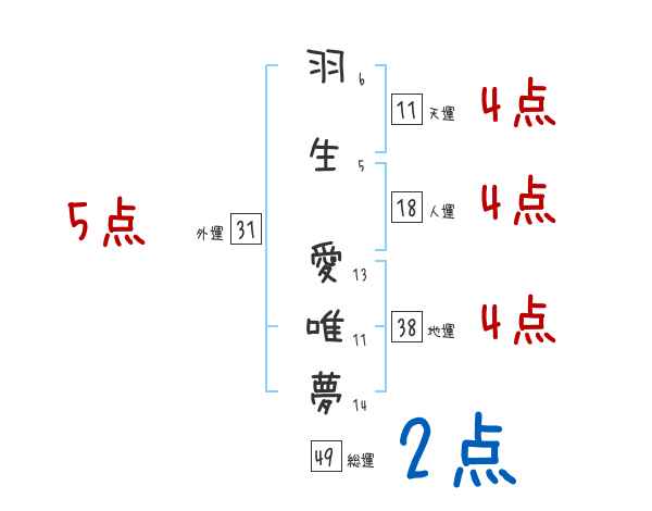 天運![]() | 羽生愛唯夢さんの天運は11画の4つ星!着実に富や地位を得る幸運な人生。 家系が持つ宿命的な運勢を表します。祖先から受け継いだ苗字ですので自分の力が及びません。家柄を象徴します。 |