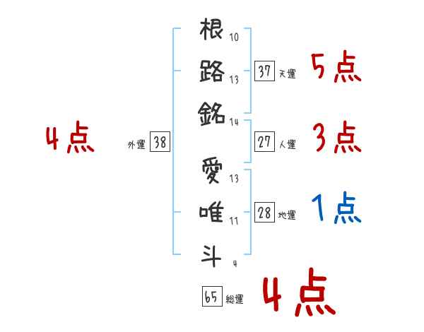 地運![]() | 根路銘愛唯斗さんの地運は28画の1つ星!家庭環境に注意。スポーツで活躍できる能力があるかも。 個性を表す基礎的な運勢です。性格形成や対人関係、行動力など家庭環境に影響されます。主に誕生してから20歳くらいまでの若年期の運勢を表します。 |