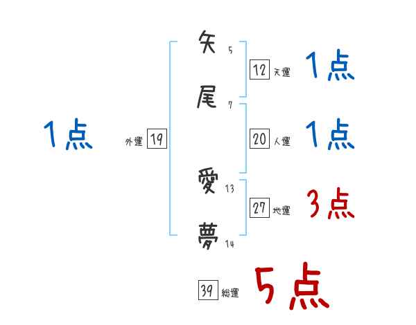 総運![]() | 矢尾愛夢さんの総運は39画の5つ星!社交性に優れ人望が厚い。人の上に立ち成功する。 あなたの人生を表す1番重要な運勢です。生涯を通じて影響する総合運となり、主に50歳以降の晩年期に影響を及ぼします。 |