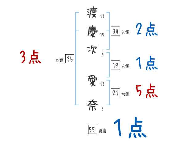 外運![]() | 渡慶次愛奈さんの外運は36画の3つ星!先見性が豊かです。多少神経質で苦労することも。 生活面を象徴する運勢です。外部から受ける影響力を表し、結婚運、家庭運や職場、環境への順応性を表します。 |