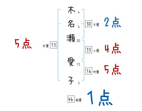 天運![]() | 木名瀬愛子さんの天運は30画の2つ星!浮き沈みの激しさに注意しましょう。 家系が持つ宿命的な運勢を表します。祖先から受け継いだ苗字ですので自分の力が及びません。家柄を象徴します。 |