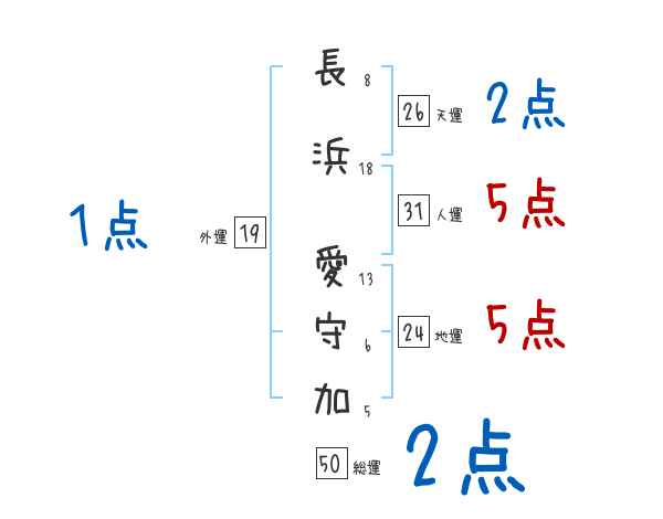 天運![]() | 長浜愛守加さんの天運は26画の2つ星!波瀾万丈かも。信頼できる人を大事にしましょう。 家系が持つ宿命的な運勢を表します。祖先から受け継いだ苗字ですので自分の力が及びません。家柄を象徴します。 |