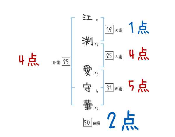 総運![]() | 江渕愛守華さんの総運は50画の2つ星!浮き沈みが激しく不安定。しりすぼみに衰退しやすいので注意しましょう。 あなたの人生を表す1番重要な運勢です。生涯を通じて影響する総合運となり、主に50歳以降の晩年期に影響を及ぼします。 |