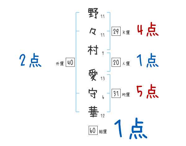 天運![]() | 野々村愛守華さんの天運は29画の4つ星!完全主義で才能がある。厳格な心の持ち主。 家系が持つ宿命的な運勢を表します。祖先から受け継いだ苗字ですので自分の力が及びません。家柄を象徴します。 |