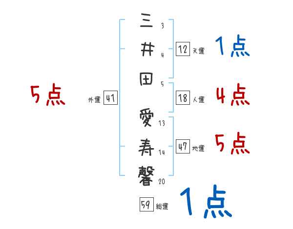 総運![]() | 三井田愛寿馨さんの総運は59画の1つ星!意志の弱さであきらめることが多いかも。粘り強さが必要。 あなたの人生を表す1番重要な運勢です。生涯を通じて影響する総合運となり、主に50歳以降の晩年期に影響を及ぼします。 |