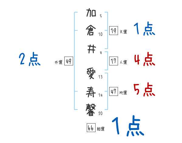 天運![]() | 加倉井愛寿馨さんの天運は19画の1つ星!優れた才能を持ちますが、協調性が足りないことも。周りの人と協力する事を意識しましょう。 家系が持つ宿命的な運勢を表します。祖先から受け継いだ苗字ですので自分の力が及びません。家柄を象徴します。 |