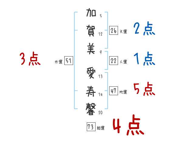 外運![]() | 加賀美愛寿馨さんの外運は51画の3つ星!変化が激しく、危険に注意。堅実な性格。 生活面を象徴する運勢です。外部から受ける影響力を表し、結婚運、家庭運や職場、環境への順応性を表します。 |