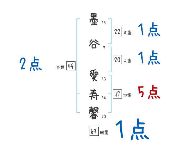 外運![]() | 墨谷愛寿馨さんの外運は49画の2つ星!不安定な性格で明暗がある人生。周りの人には支援されやすい。 生活面を象徴する運勢です。外部から受ける影響力を表し、結婚運、家庭運や職場、環境への順応性を表します。 |