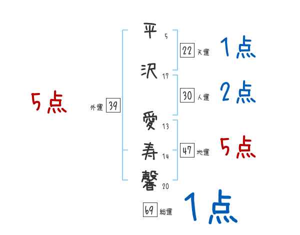 外運![]() | 平沢愛寿馨さんの外運は39画の5つ星!社交性に優れ人望が厚い。人の上に立ち成功する。 生活面を象徴する運勢です。外部から受ける影響力を表し、結婚運、家庭運や職場、環境への順応性を表します。 |