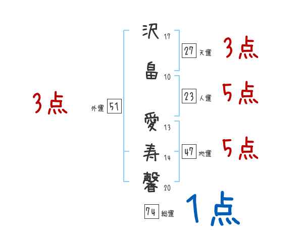 総運![]() | 沢畠愛寿馨さんの総運は74画の1つ星!無気力で怠惰な生活送りがち。規則正しい生活を送るよう気をつけましょう。 あなたの人生を表す1番重要な運勢です。生涯を通じて影響する総合運となり、主に50歳以降の晩年期に影響を及ぼします。 |