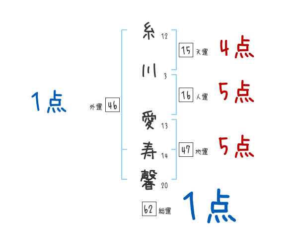 人運![]() | 糸川愛寿馨さんの人運は16画の5つ星!人望が厚く大きく発展する。逆転成功が見える。 性格や才能などを表す2番目に重要な運勢です。人間関係や協調性、社会的な成功に影響します。主に20歳から50歳ぐらいまでの中年期の運勢を表します。 |