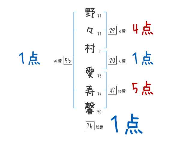 天運![]() | 野々村愛寿馨さんの天運は29画の4つ星!完全主義で才能がある。厳格な心の持ち主。 家系が持つ宿命的な運勢を表します。祖先から受け継いだ苗字ですので自分の力が及びません。家柄を象徴します。 |