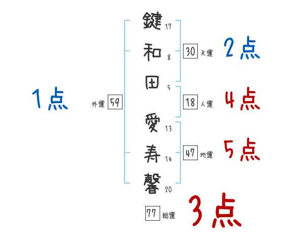 天運![]() | 鍵和田愛寿馨さんの天運は30画の2つ星!浮き沈みの激しさに注意しましょう。 家系が持つ宿命的な運勢を表します。祖先から受け継いだ苗字ですので自分の力が及びません。家柄を象徴します。 |