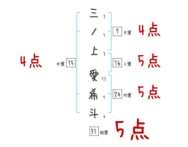 天運![]() | 三ノ上愛希斗さんの天運は7画の4つ星!強い意志や信念を持ち独立心が強い。自立する。 家系が持つ宿命的な運勢を表します。祖先から受け継いだ苗字ですので自分の力が及びません。家柄を象徴します。 |