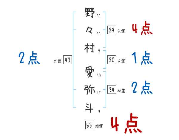天運![]() | 野々村愛弥斗さんの天運は29画の4つ星!完全主義で才能がある。厳格な心の持ち主。 家系が持つ宿命的な運勢を表します。祖先から受け継いだ苗字ですので自分の力が及びません。家柄を象徴します。 |