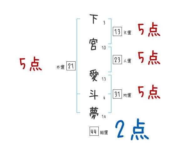 天運![]() | 下宮愛斗夢さんの天運は13画の5つ星!才能に恵まれ人気がある。名声を手に入れる。円満な人生。 家系が持つ宿命的な運勢を表します。祖先から受け継いだ苗字ですので自分の力が及びません。家柄を象徴します。 |