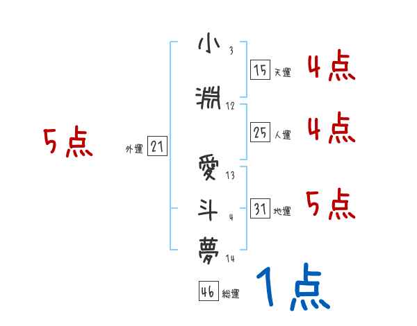 外運![]() | 小淵愛斗夢さんの外運は21画の5つ星!統率力がある。独立し成功する。名誉を手に入れる。 生活面を象徴する運勢です。外部から受ける影響力を表し、結婚運、家庭運や職場、環境への順応性を表します。 |