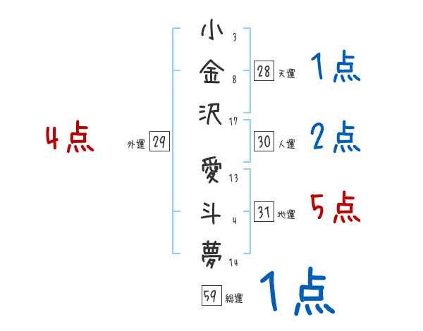 天運![]() | 小金沢愛斗夢さんの天運は28画の1つ星!家庭環境に注意。スポーツで活躍できる能力があるかも。 家系が持つ宿命的な運勢を表します。祖先から受け継いだ苗字ですので自分の力が及びません。家柄を象徴します。 |
