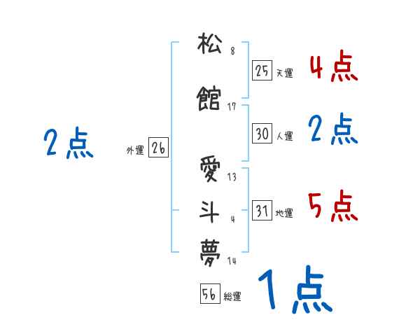 外運![]() | 松館愛斗夢さんの外運は26画の2つ星!波瀾万丈かも。信頼できる人を大事にしましょう。 生活面を象徴する運勢です。外部から受ける影響力を表し、結婚運、家庭運や職場、環境への順応性を表します。 |