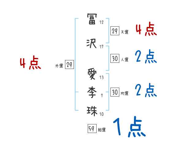 外運![]() | 冨沢愛李珠さんの外運は29画の4つ星!完全主義で才能がある。厳格な心の持ち主。 生活面を象徴する運勢です。外部から受ける影響力を表し、結婚運、家庭運や職場、環境への順応性を表します。 |