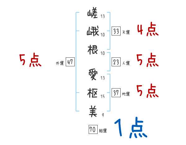 人運![]() | 嵯峨根愛枢美さんの人運は23画の5つ星!想像力に優れ活力がある。一代で成功し名誉を手に入れる。 性格や才能などを表す2番目に重要な運勢です。人間関係や協調性、社会的な成功に影響します。主に20歳から50歳ぐらいまでの中年期の運勢を表します。 |