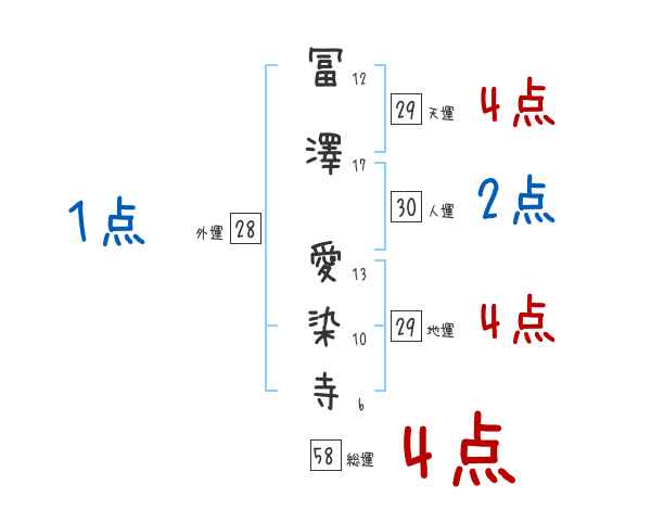 外運![]() | 冨澤愛染寺さんの外運は28画の1つ星!家庭環境に注意。スポーツで活躍できる能力があるかも。 生活面を象徴する運勢です。外部から受ける影響力を表し、結婚運、家庭運や職場、環境への順応性を表します。 |