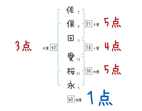 天運![]() | 佐保田愛桜永さんの天運は21画の5つ星!統率力がある。独立し成功する。名誉を手に入れる。 家系が持つ宿命的な運勢を表します。祖先から受け継いだ苗字ですので自分の力が及びません。家柄を象徴します。 |
