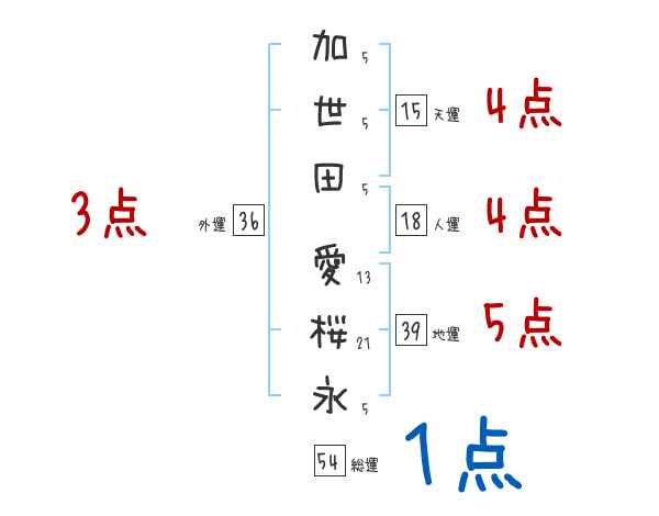 天運![]() | 加世田愛桜永さんの天運は15画の4つ星!人徳があり出世する。順調に物事を進め円満な人生。 家系が持つ宿命的な運勢を表します。祖先から受け継いだ苗字ですので自分の力が及びません。家柄を象徴します。 |