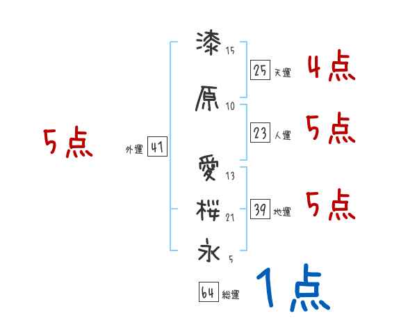 | 外運  | 漆原愛桜永さんの外運は41画の5つ星!大志を抱き、目標に向かって実力を発揮し達成する。温和な性格。生活面を象徴する運勢です。外部から受ける影響力を表し、結婚運、家庭運や職場、環境への順応性を表します。 |