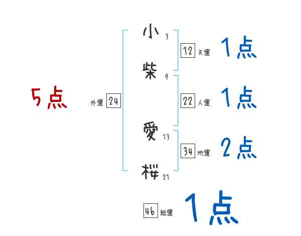 外運![]() | 小柴愛桜さんの外運は24画の5つ星!家庭運が良く順調な人生。金運にも恵まれる。 生活面を象徴する運勢です。外部から受ける影響力を表し、結婚運、家庭運や職場、環境への順応性を表します。 |