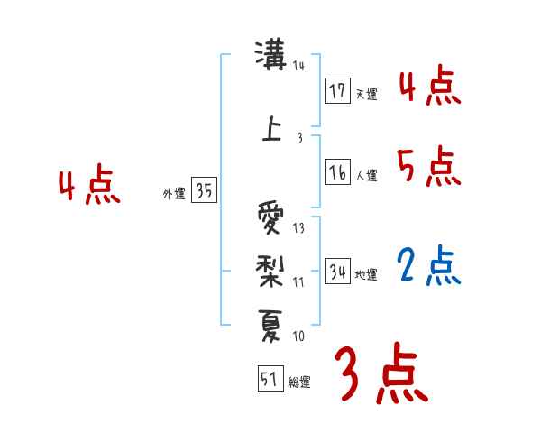 | 外運  | 溝上愛梨夏さんの外運は35画の4つ星!温厚な性格で感受性が高い。穏和な性格で人望が厚い。生活面を象徴する運勢です。外部から受ける影響力を表し、結婚運、家庭運や職場、環境への順応性を表します。 |