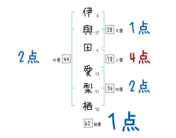 外運![]() | 伊與田愛梨栖さんの外運は44画の2つ星!誠実で慎重な性格。物事を考えすぎないように注意しましょう。 生活面を象徴する運勢です。外部から受ける影響力を表し、結婚運、家庭運や職場、環境への順応性を表します。 |